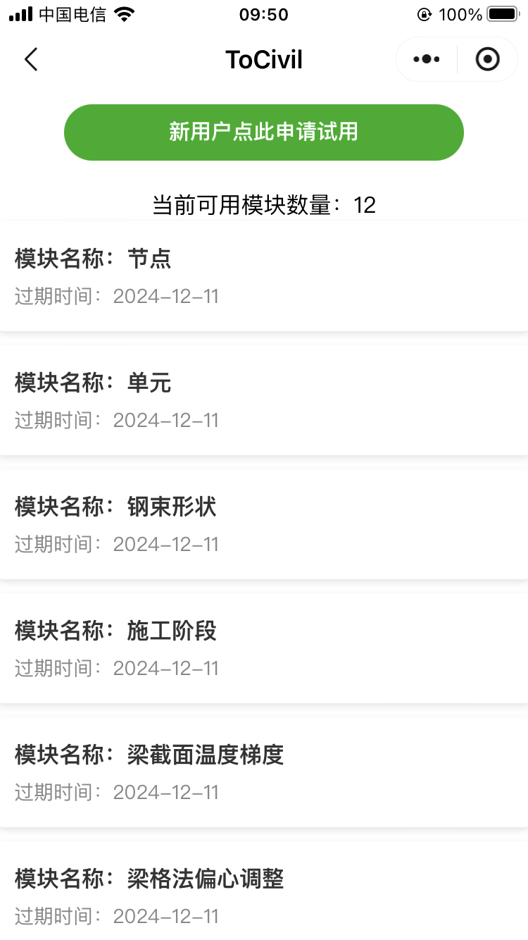随后点击“模块功能管理”,在最顶部位置可以看到“新用户点此申请试用”按钮,点击后,程序会自动下发授权,新用户会获得7天(该时长不固定,以实际获得的天数为准)的全模块试用期