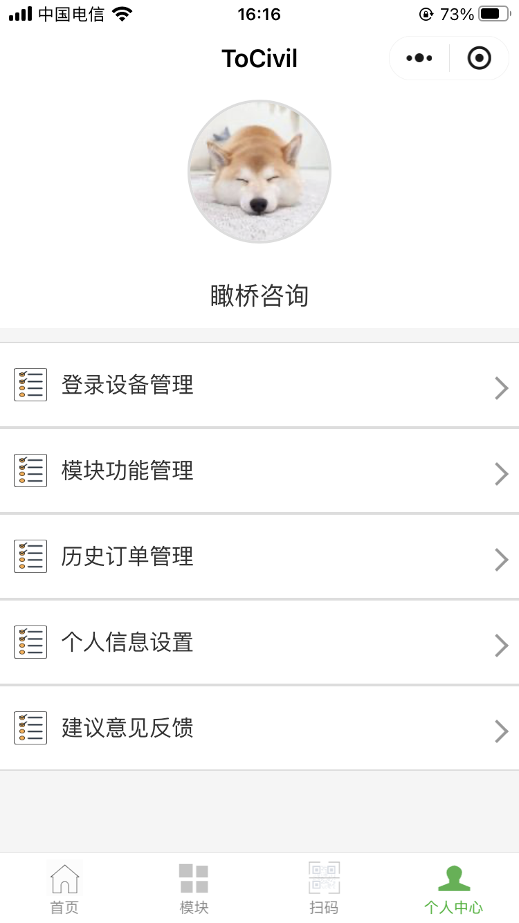 可以使用微信扫描网页的登录二维码后,在ToCivil小程序中点击"个人中心"标签页